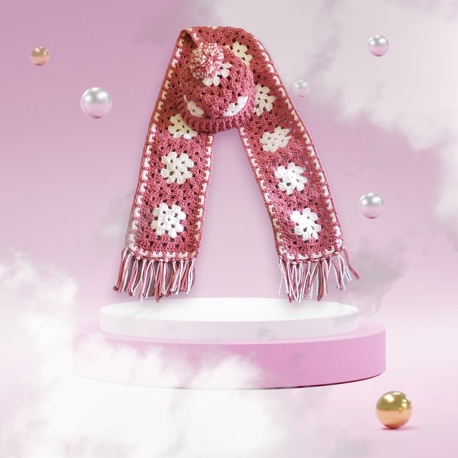 Stay cozy and stylish with our Granny Square Style Hat & Scarf Set! Made with a soft blend of acrylic and wool yarn, this set features a playful granny square design in your choice of espresso & white or rose & white. Hand wash and air dry for easy maintenance. Measures 62 inches long and 6 inches wide.